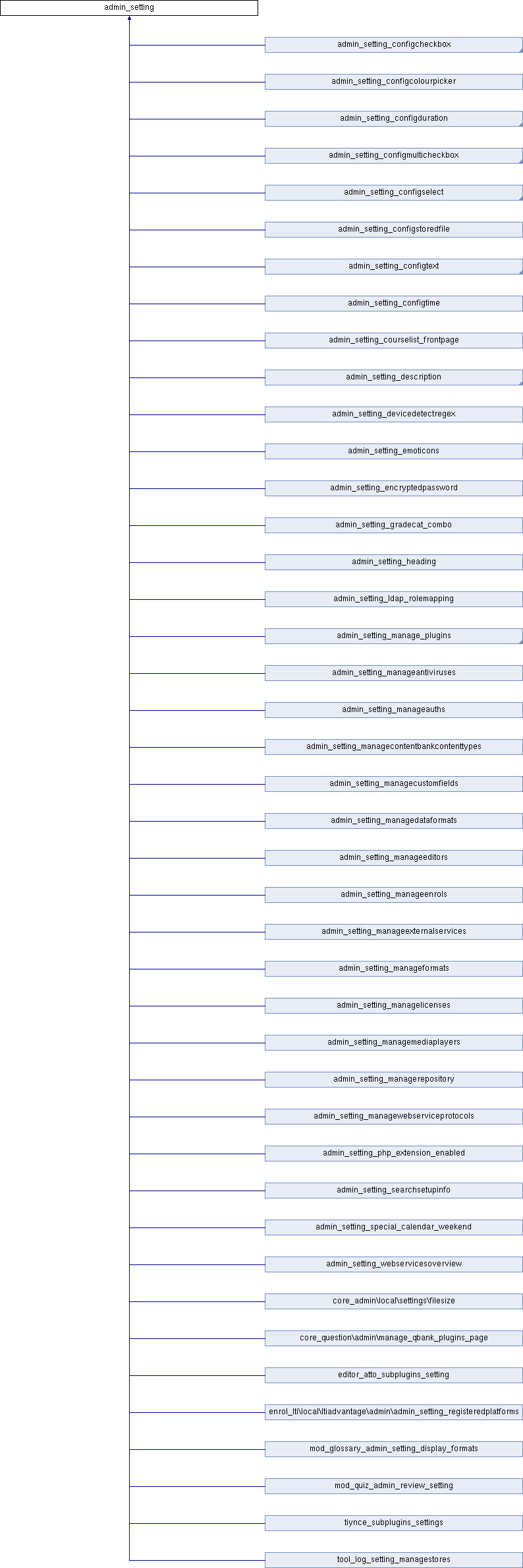 Reimplemented in core_admin\local\settings\autocomplete, core_admin\local\settings\filesize, tool_log_setting_managestores, admin_setting_ldap_rolemapping, enrol_lti\local\ltiadvantage\admin\admin_setting_registeredplatforms, admin_setting_heading, admin_setting_description, admin_setting_configtext, admin_setting_encryptedpassword, admin_setting_configcheckbox, admin_setting_configmulticheckbox, admin_setting_configmulticheckbox2, admin_setting_configselect, admin_setting_configmultiselect, admin_setting_configtime, admin_setting_configduration, admin_setting_configmixedhostiplist, admin_setting_users_with_capability, admin_setting_special_selectsetup, admin_setting_sitesetselect, admin_setting_courselist_frontpage, admin_setting_sitesetcheckbox, admin_setting_sitesettext, admin_setting_special_frontpagedesc, admin_setting_emoticons, admin_setting_special_calendar_weekend, admin_setting_gradecat_combo, admin_setting_manageenrols, admin_setting_manageauths, admin_setting_manageeditors, admin_setting_manageantiviruses, admin_setting_managelicenses, admin_setting_manageformats, admin_setting_managecustomfields, admin_setting_managedataformats, admin_setting_manage_plugins, admin_setting_managemediaplayers, admin_setting_managecontentbankcontenttypes, admin_setting_managerepository, admin_setting_enablemobileservice, admin_setting_manageexternalservices, admin_setting_webservicesoverview, admin_setting_managewebserviceprotocols, admin_setting_configcolourpicker, admin_setting_configstoredfile, admin_setting_devicedetectregex, admin_setting_php_extension_enabled, admin_setting_searchsetupinfo, editor_atto_subplugins_setting, tiynce_subplugins_settings, mod_glossary_admin_setting_display_formats, mod_quiz_admin_review_setting, and core_question\admin\manage_qbank_plugins_page.